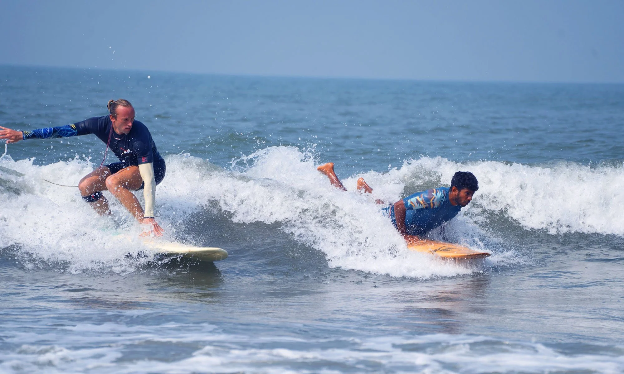 The lessons are conducted in the shallow waters of Morjim Beach, making it easier for beginners and non-swimmers to experience the thrill of surfing.